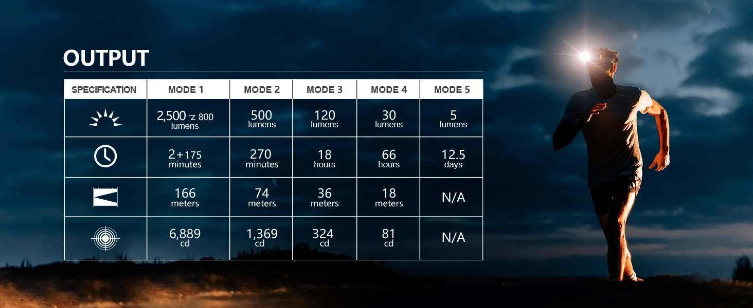 - Turbo 2500 → 800 lm / 2,5 min + 175 min; Høj 500 lm / 270 min; Mellem 120 lm / 18 t; Lav 30 lm / 66 t; Moonlight 5 lm / 12,5 dage; SOS/fyrtårn