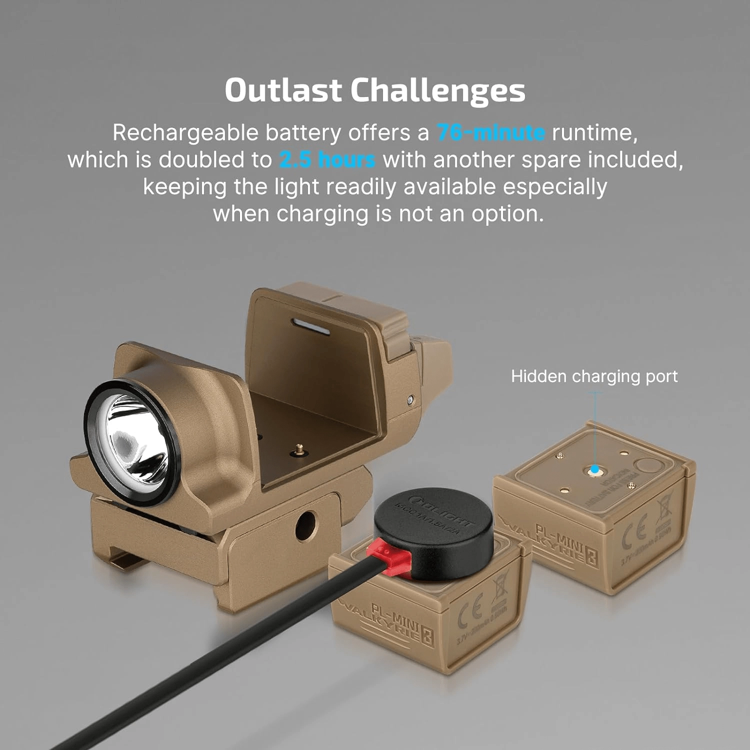 Det integrerede 260 mAh Li‑Pol batteri oplades via OLIGHTs magnetkabel – ingen adskillelse, ingen kabler omkring våbnet, altid klar.