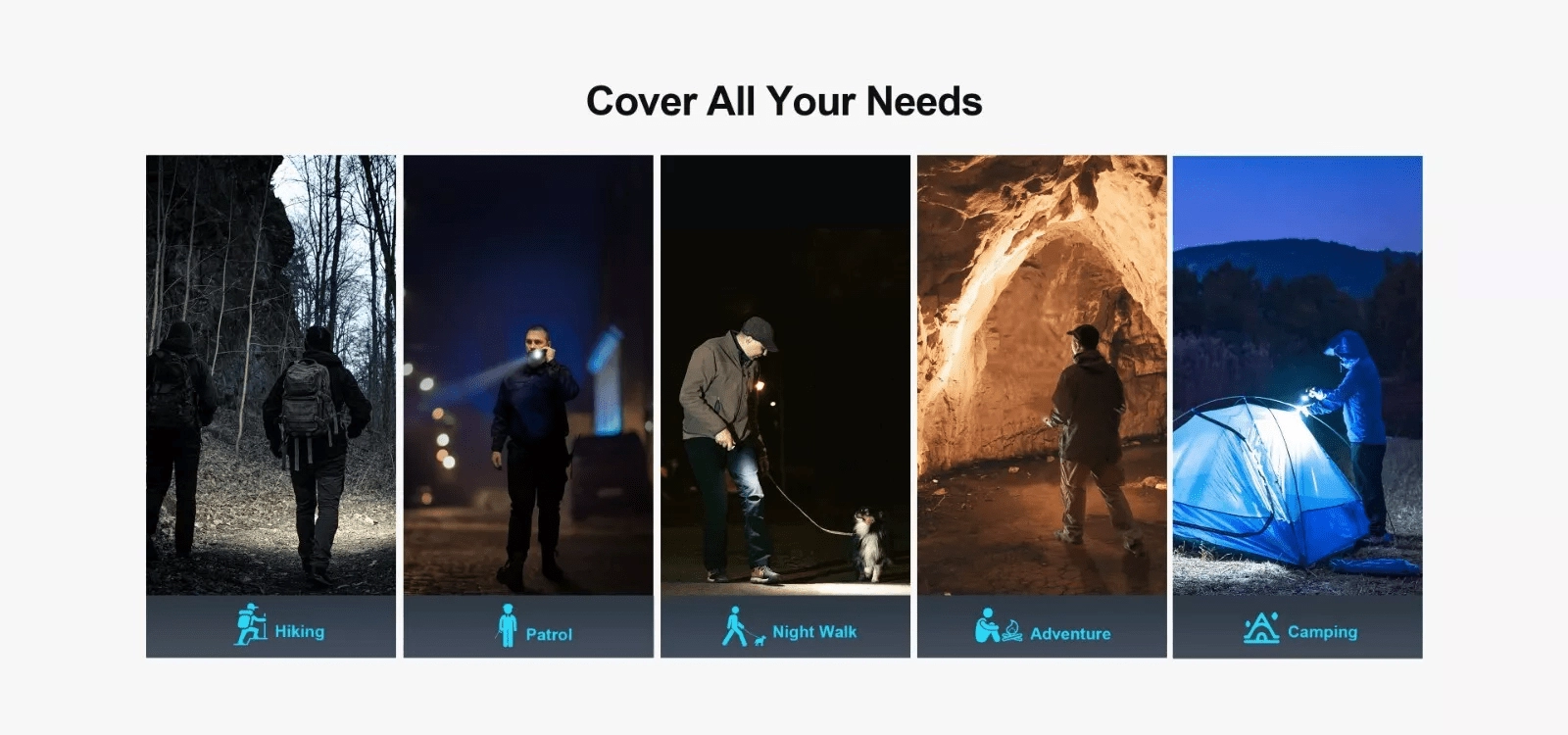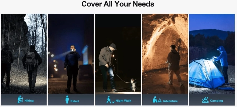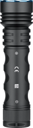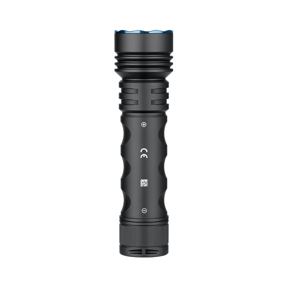 Takket være 21700 5000 mAh batteriet kan den lyse i op til 15 dage i Moon‑tilstand. Opladningen er hurtig og bekvem via USB‑C port skjult under støvdæksel, samtidig med at IPX8‑vand­tæthed bevares. Den forbedrede metal sideknap og trefarvede indikator for batteristatus sikrer pålidelig betjening i enhver situation.