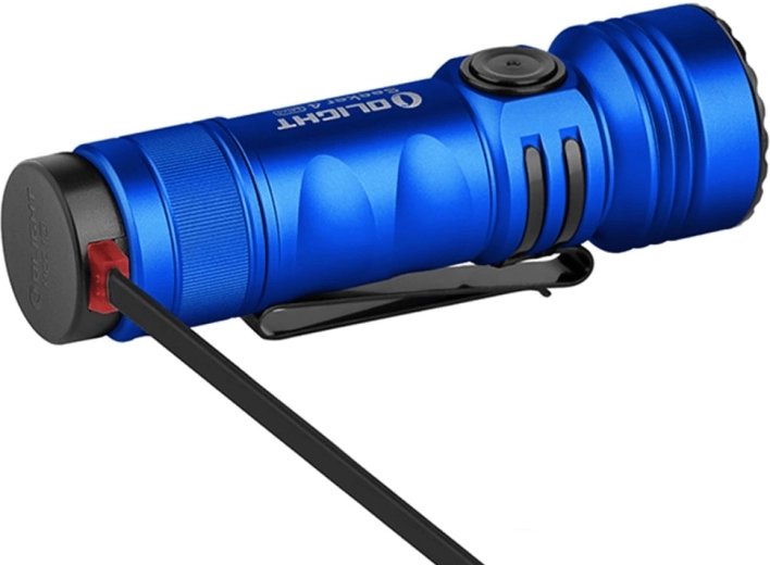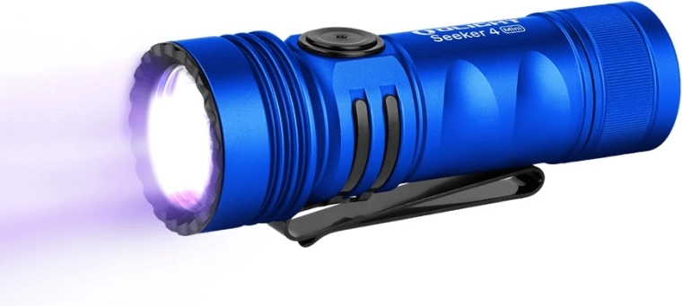 Den kompakte lommelygte OLIGHT Seeker 4 Mini i blå farve kombinerer hvidt lys og UV 365 nm (760 mW) til hverdagsbrug, kontrol af renlighed, detektion af fluorescerende stoffer samt outdoor. Den tilbyder op til 1200 lm, op til 12 dages driftstid, magnetisk opladning og IPX8 vandtæthed i et robust aluminiums-hus med tovejsklip og metal-sideknap med statusindikator.