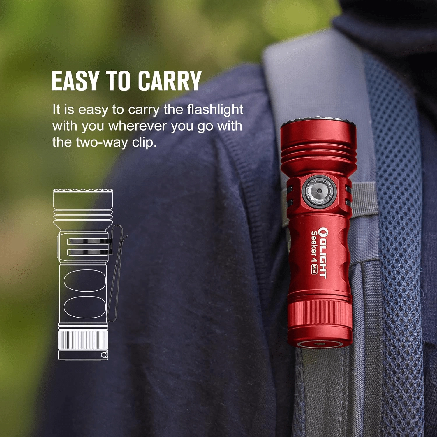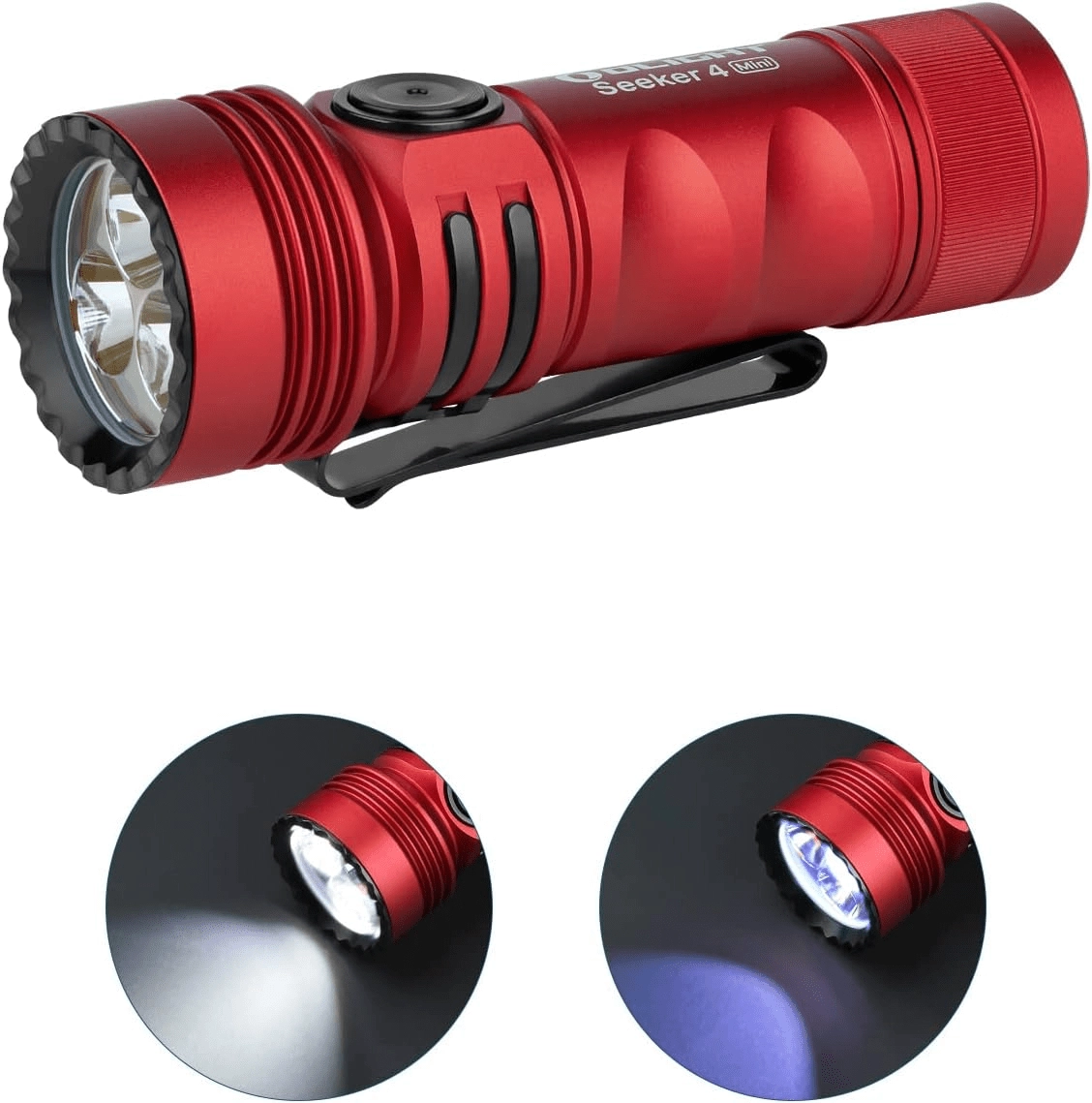 OLIGHT Seeker 4 Mini Red er en kraftfuld lommelygte, der i ét hus forener hvidt lys (5700–6700 K) og UV 365 nm (760 mW). Afslør nemt fluorescerende stoffer, væskelækager, snavs på hoteller eller i dokumenter, og få samtidig en stærk hvid kegle til vandring, service og daglig brug. De kompakte mål passer i lomme, rygsæk og EDC‑organizer.