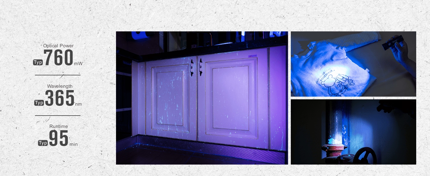 - UV 365 nm (760 mW) til inspektion, rengøring og outdoor-brug