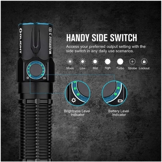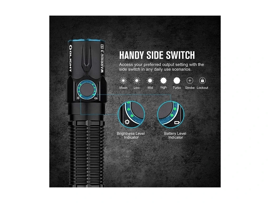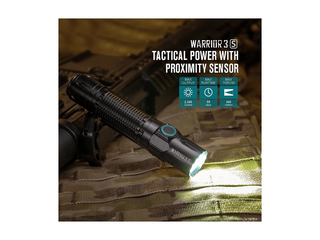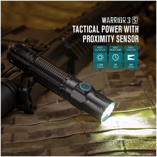 OLIGHT Warrior 3S er en kraftig taktisk EDC-lygte med lommeklip, der leverer op til 2300 lumen, en rækkevidde på 300 meter og dobbelt betjening med både sideknap og bageste kontakt. Den har en nærhedssensor for sikker lysdæmpning, hurtig opladning via magnetisk USB-kabel MCC3 og en overskuelig 4-trins batteriindikator. Den robuste konstruktion i aluminiumlegering opfylder IPX8 og tåler fald fra 1,5 m.