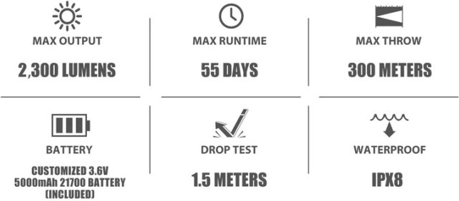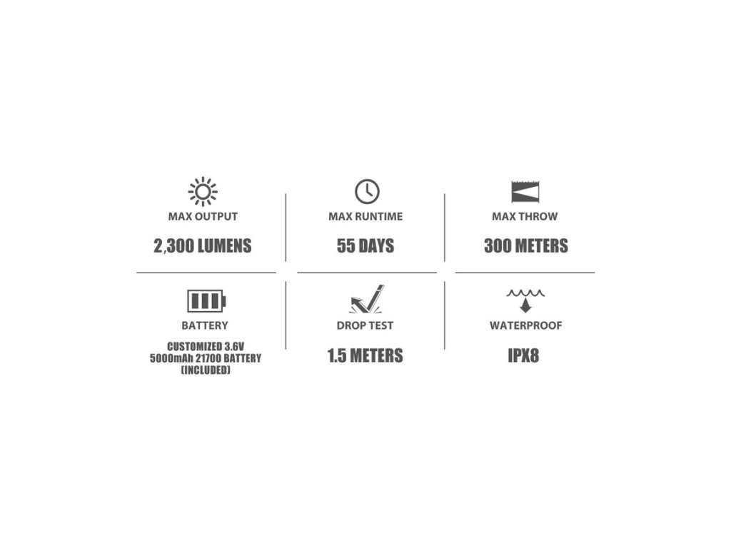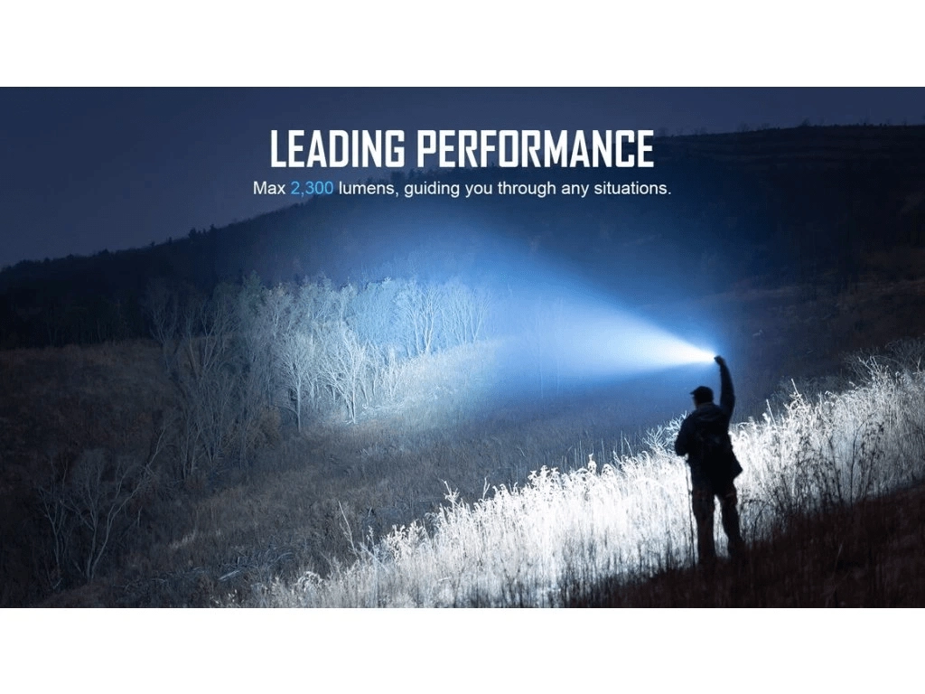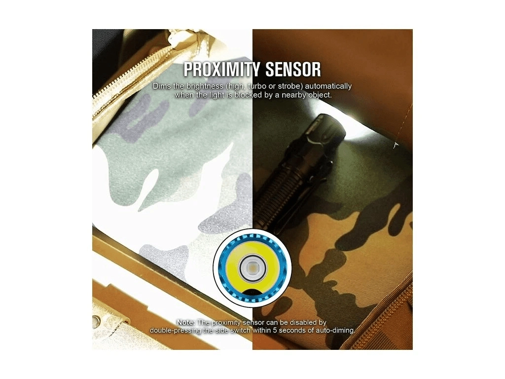 Den integrerede nærhedssensor sænker automatisk lysstyrken i turbo-tilstand for øget sikkerhed og beskyttelse mod blænding eller overophedning. Strøm fra det kraftige 21700 5000 mAh batteri sikrer lang driftstid, og bekvem opladning muliggøres af det magnetiske USB-kabel MCC3, som medfølger. Det robuste kabinet i flyaluminium tilbyder vandtæthed IPX8, faldmodstand fra 1,5 m og sikkert greb takket være den teksturerede overflade.
