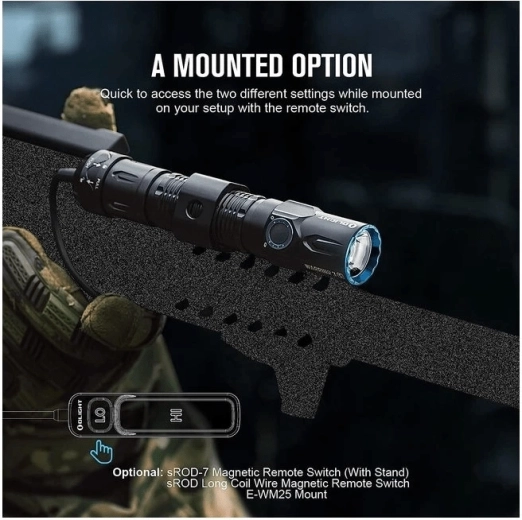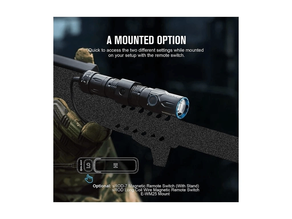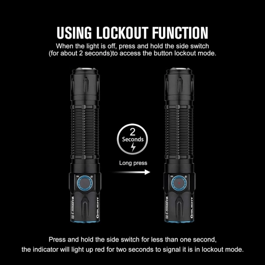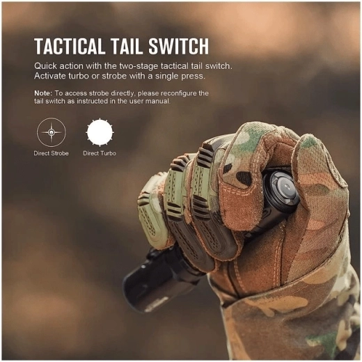 - Hurtig taktisk betjening: lydløs bagkontakt til øjeblikkelig 100 % lys eller stroboskop, sideknap med lås mod utilsigtet aktivering.