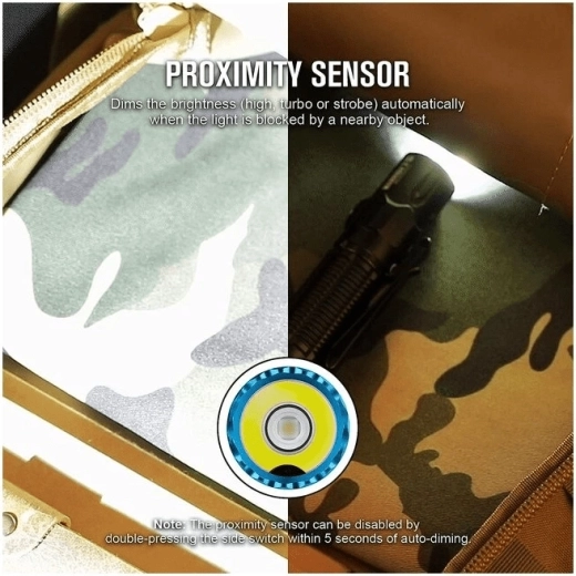 Sideknap til valg af tilstande, bageste taktiske kontakt til øjeblikkelig turbo/stroboskop. Sensoren dæmper automatisk lysstyrken tæt på forhindringer.