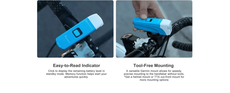 Det universelle Garmin™-interface muliggør lynhurtig på- og afmontering fra styret. Den kompakte konstruktion er også ideel som hjelmlys.
