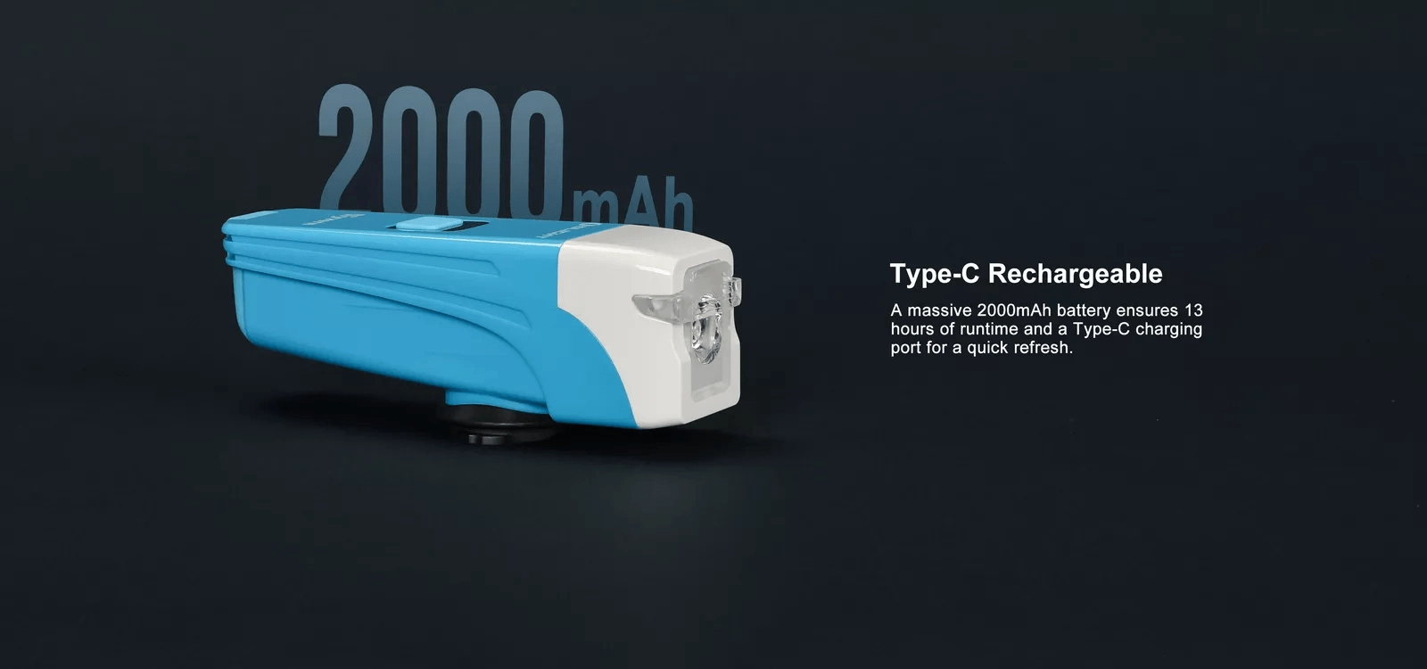 Takket være det integrerede 2000 mAh batteri og USB‑C opladning fyldes energien på på cirka 2,5 timer, og du får op til 13 timers lys afhængigt af valgt tilstand. Den store topknap gør betjeningen let selv med handsker, og låsefunktionen forhindrer utilsigtet tænding i tasken.