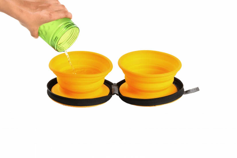 Praktisk sæt med to foldbare skåle af kvalitets-silikone til både foder og vand – hver med en kapacitet på 350 ml. Skålene ligger i et robust etui med velcrostrop til fastgørelse og en sikker lynlåslukning for nem transport på farten.