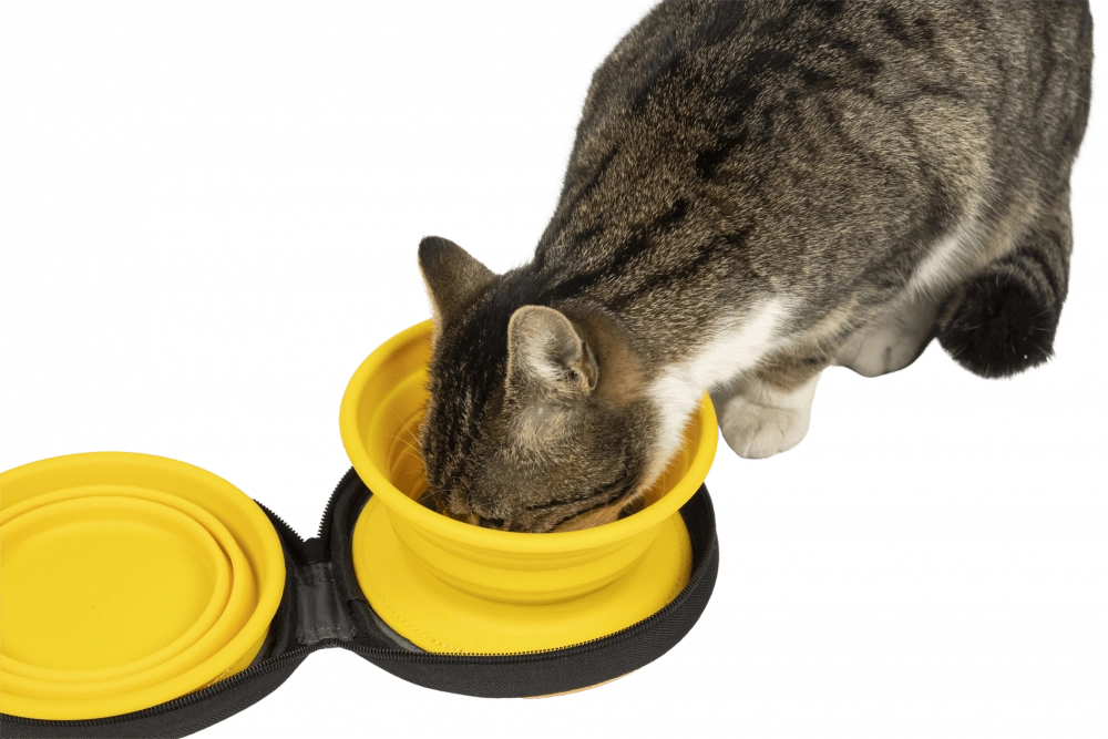 Praktisk rejsesæt med to sammenklappelige skåle af kvalitets-silikone til både foder og vand. Hver skål rummer op til 350 ml, er let, holdbar og nem at rengøre. Skålene er fastgjort med velcro i et etui med lynlås, så du nemt kan tage dem med på udflugt, ferie og vandretur med hund eller kat.