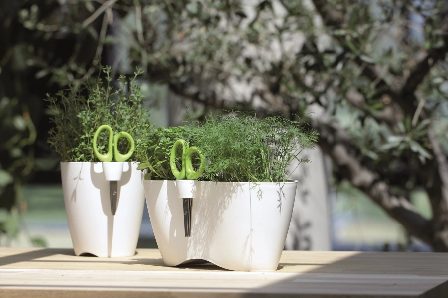 Inkluderet er en praktisk holder til saks og en saks med tredobbelt klinge til hurtig og præcis klipning af blade. Det modstandsdygtige materiale tåler udendørs forhold og sollys, så urtepotten er ideel både til indendørs og udendørs brug.