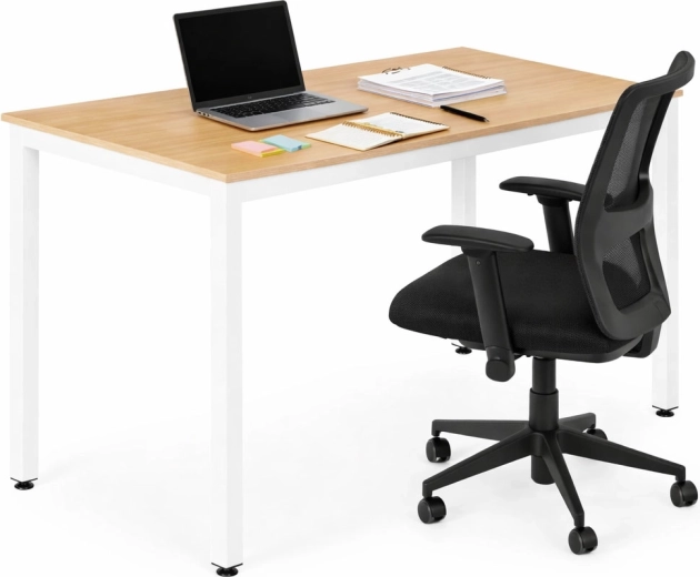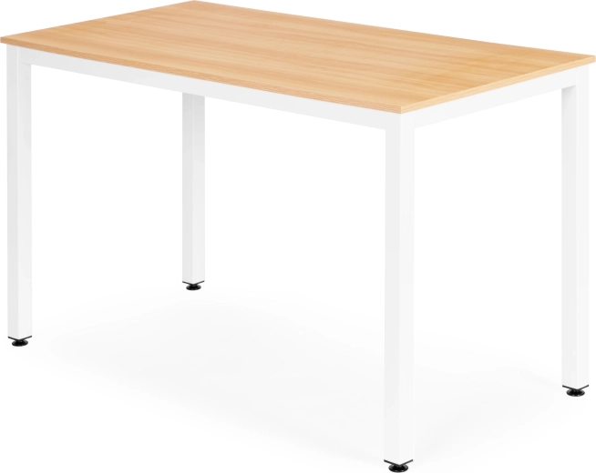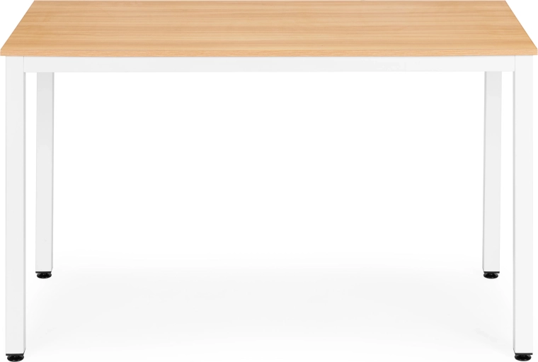 Den robuste MDF-bordplade med melaminoverflade i lys eg er glat, nem at rengøre og modstandsdygtig over for daglig brug. Pulverlakerede metalben i hvid farve giver stabilitet, et moderne look og beskytter mod korrosion og let slitage. Justerbare udligningsfødder eliminerer vippen på ujævne gulve og beskytter samtidig gulvet mod ridser.