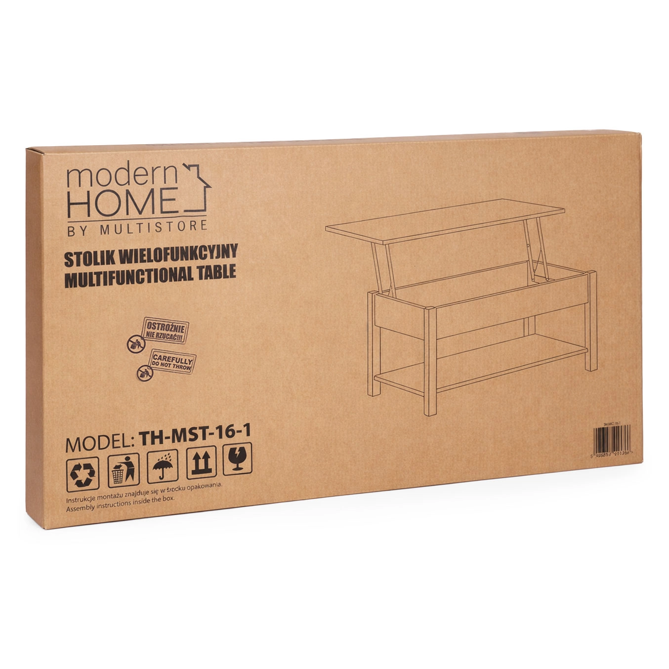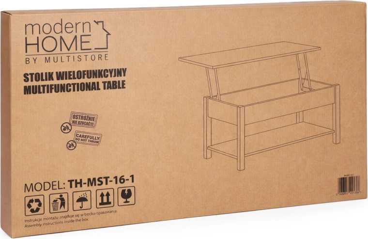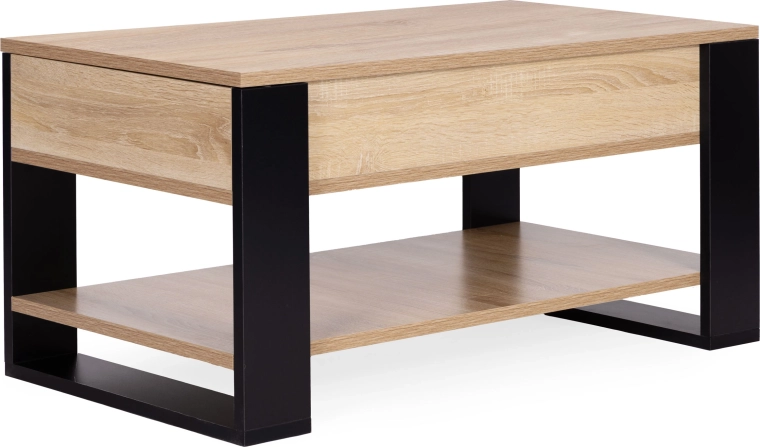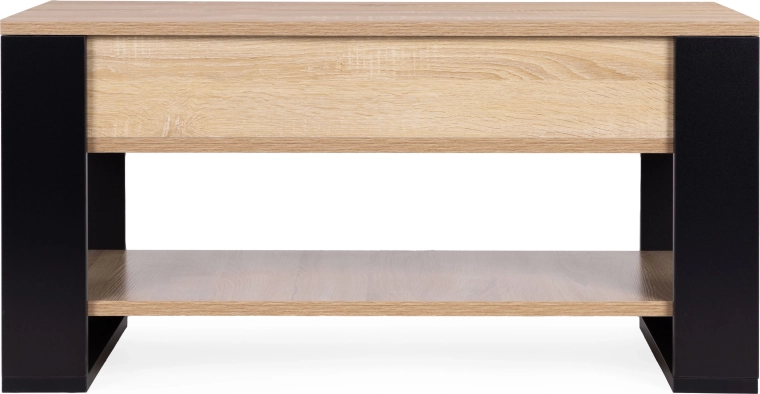 Under pladen finder du en stor skjult boks til fjernbetjeninger, dokumenter og andre småting, mens den åbne nederste hylde rummer bøger, magasiner eller dekorationer. Den metalliske løftemekanisme sikrer jævn og stabil bevægelse og holder pladen sikkert i position uden pludseligt nedslag.