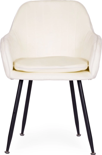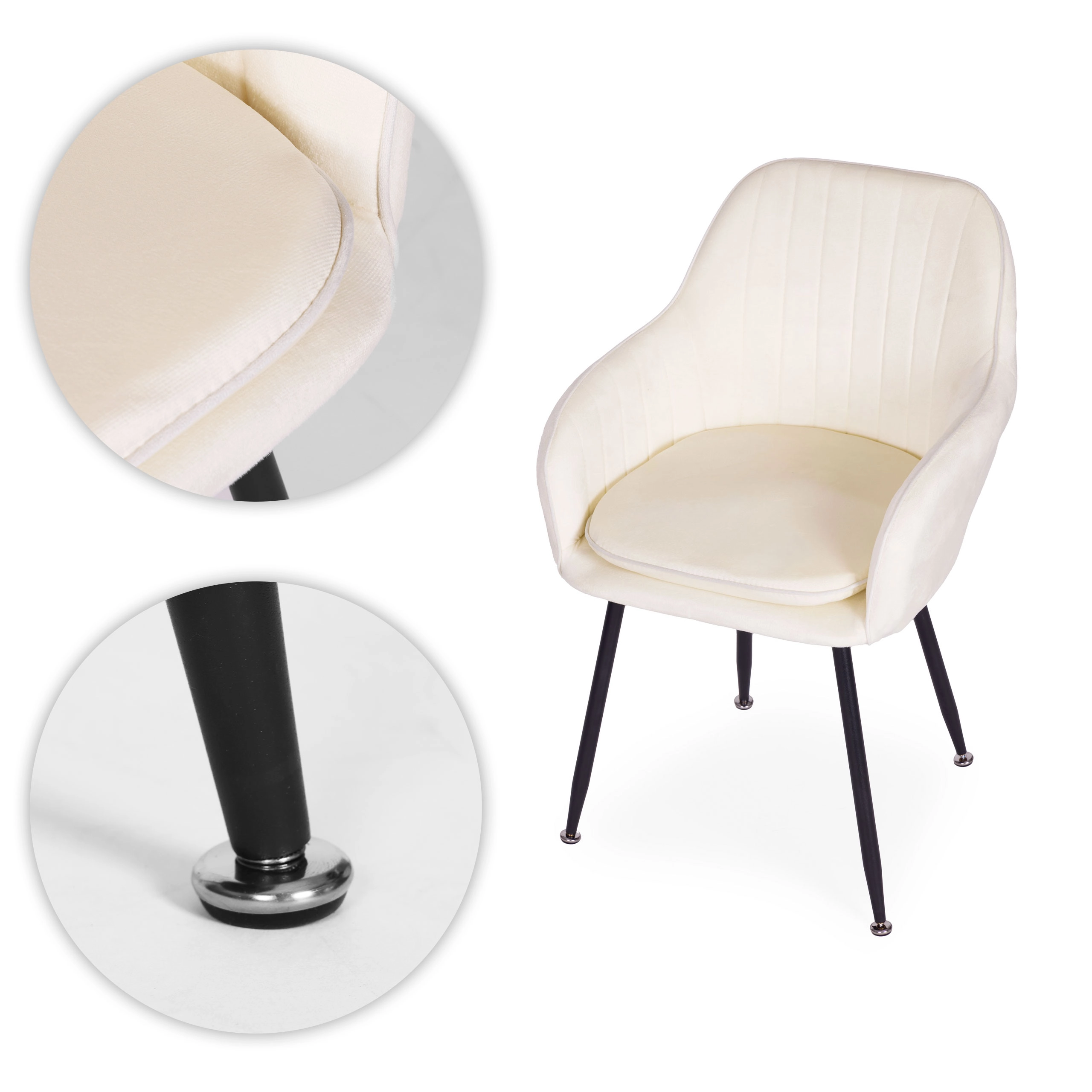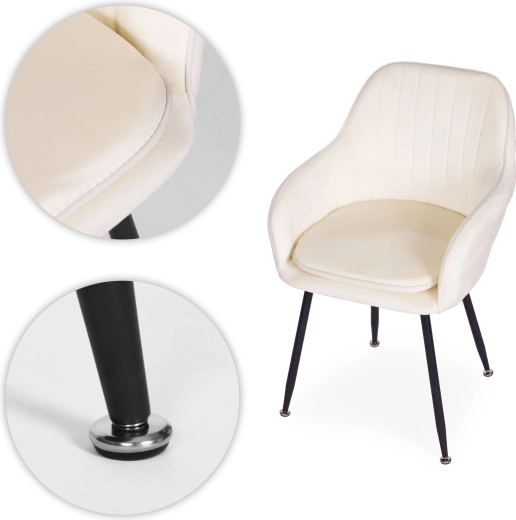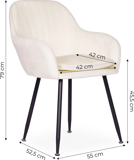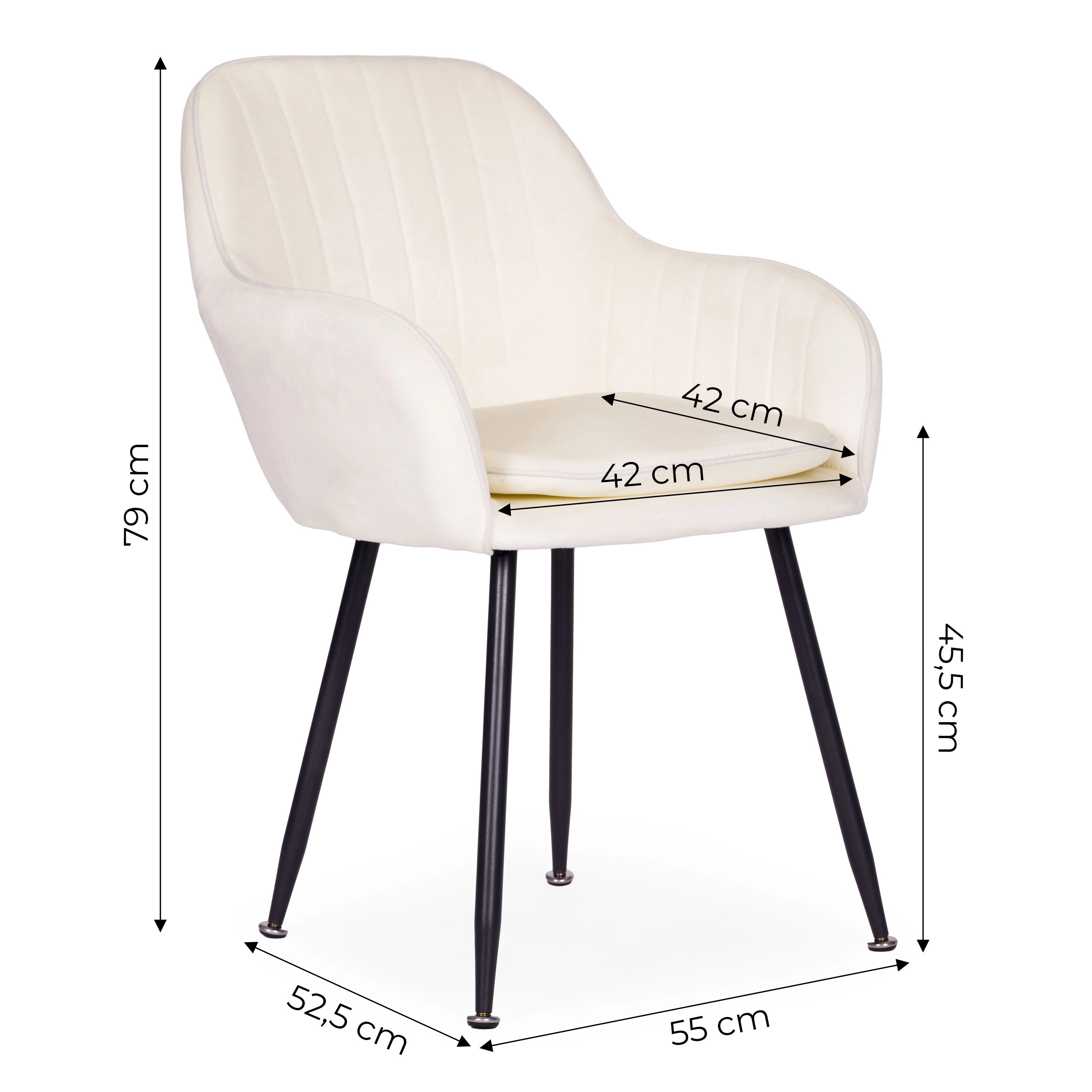 Stilfuld cremefarvet stol fra ModernHome med blød fløjlspolstring, behageligt ryglæn med armlæn og slanke ben i stål, som giver et elegant udtryk og daglig komfort. Ideel til spisestuen og stuen, passer nemt ind i moderne og glamourøse interiører. Bæreevne 120 kg, stabil konstruktion og beskyttende fødder mod ridser i gulvet.