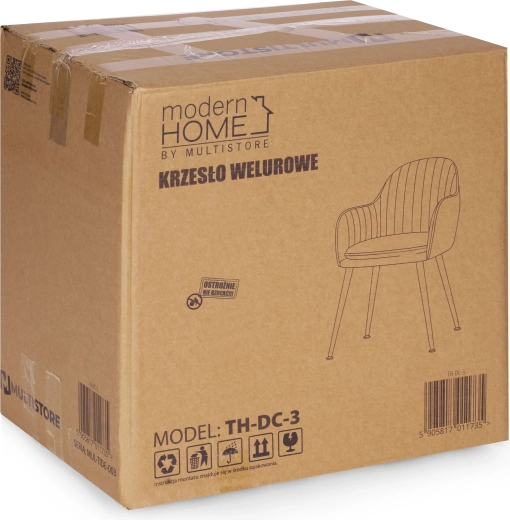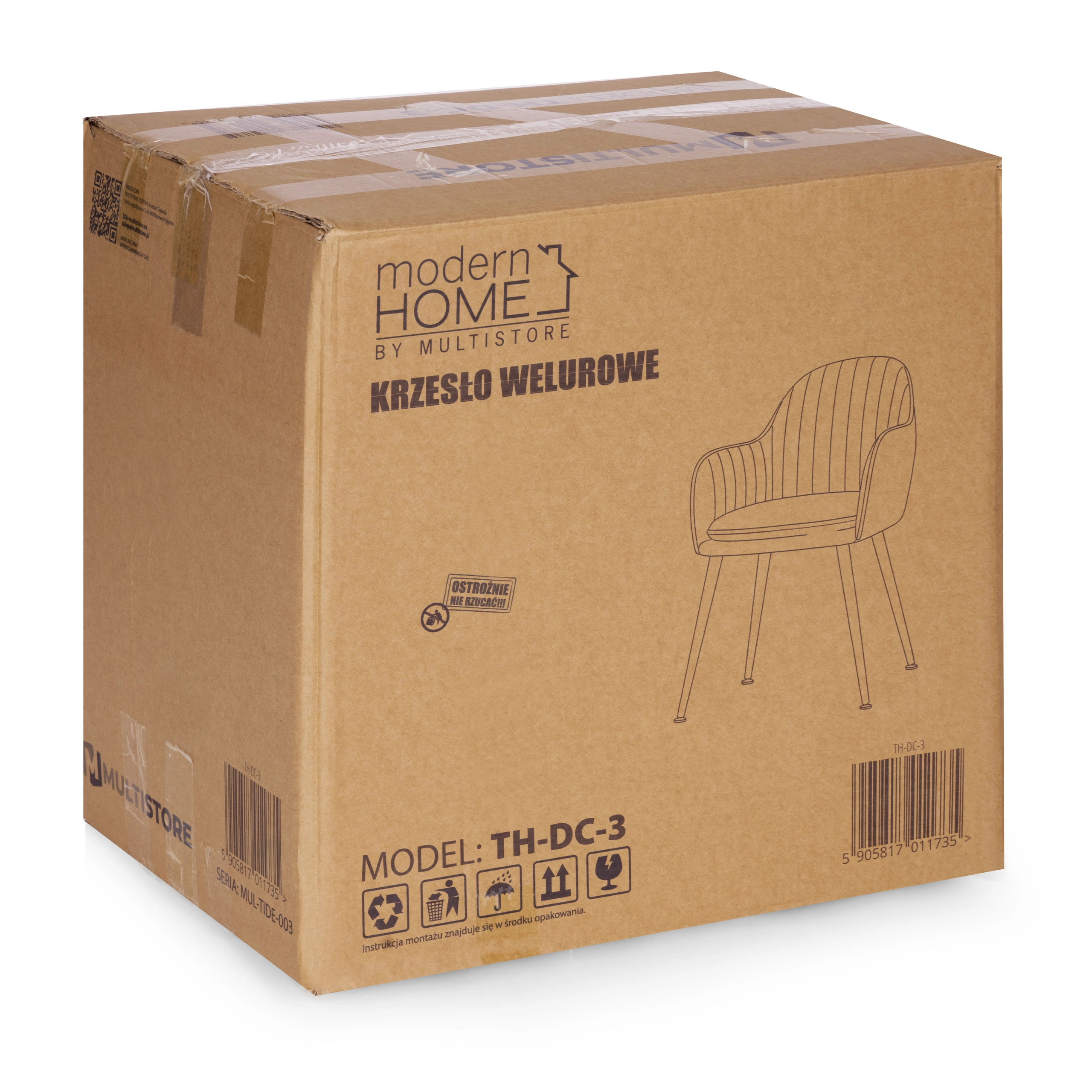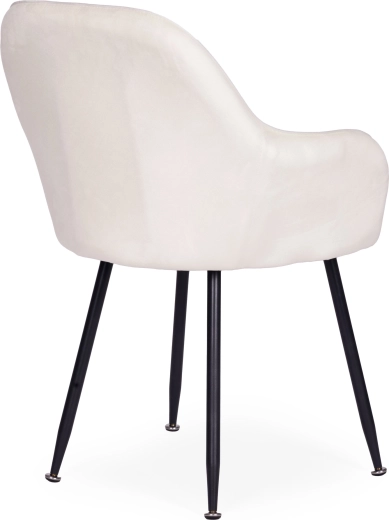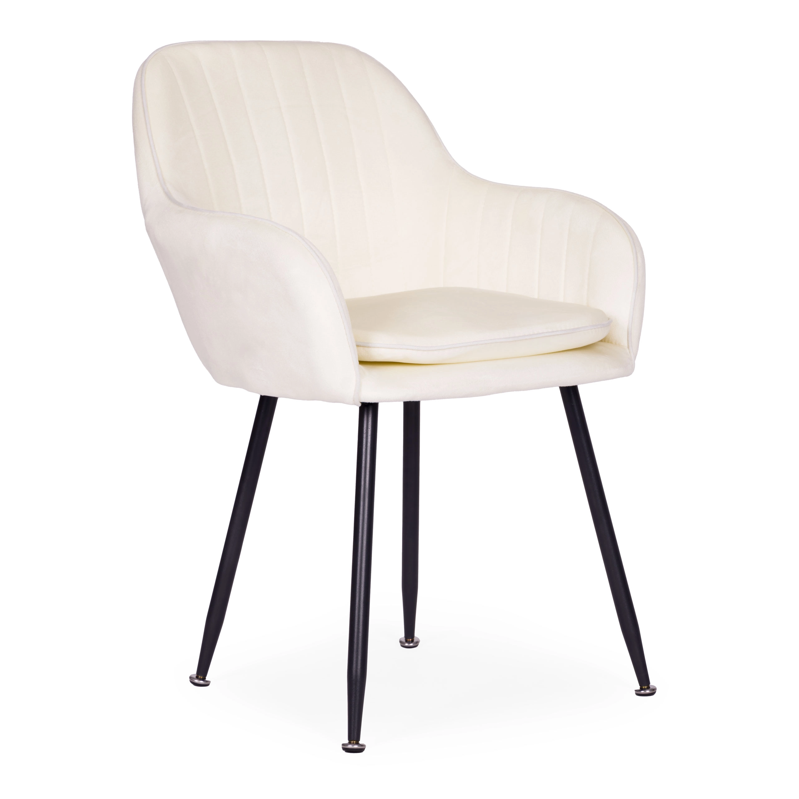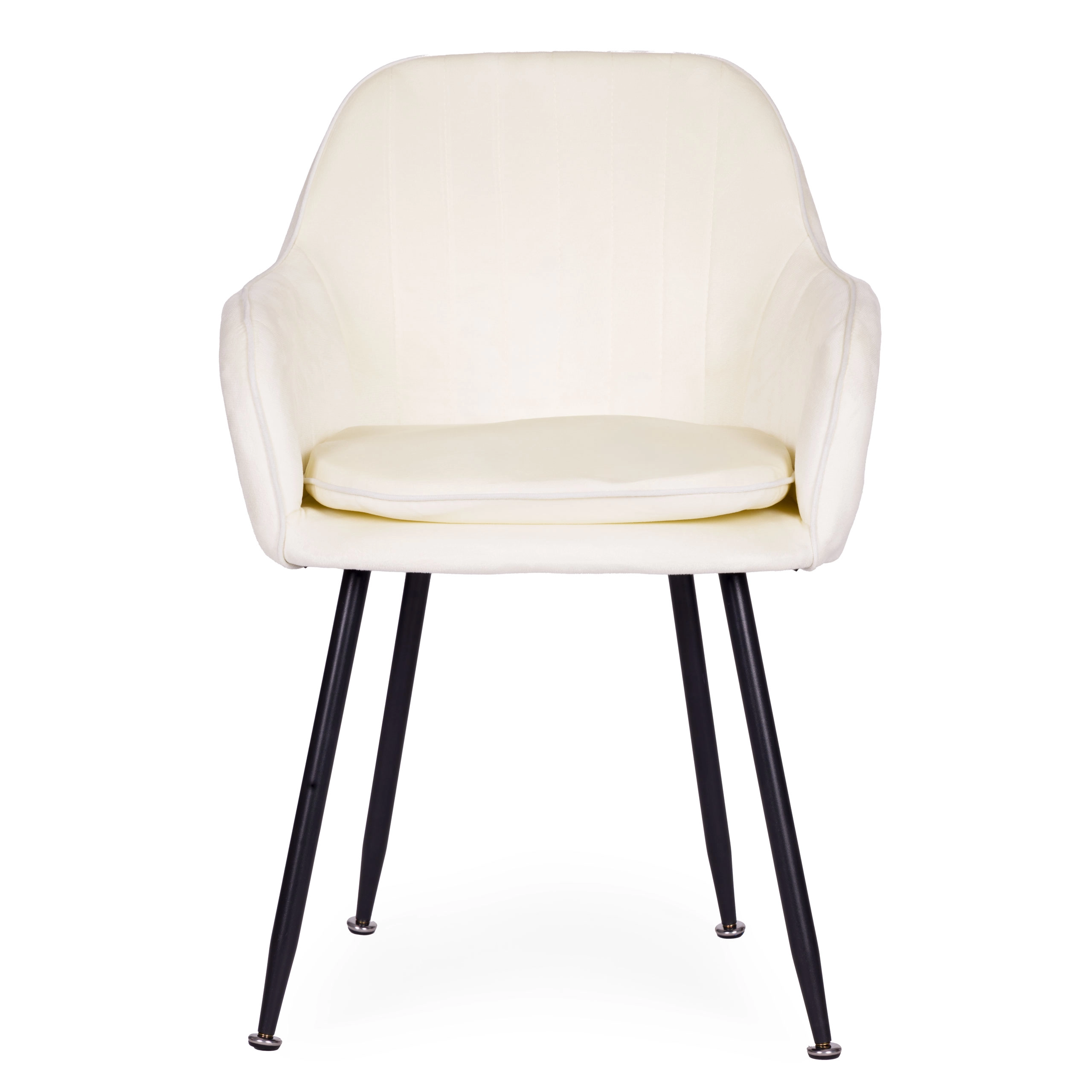 Stilfuld cremefarvet stol fra ModernHome med blød fløjlspolstring, behageligt ryglæn med armlæn og slanke ben i stål, som giver et elegant udtryk og daglig komfort. Ideel til spisestuen og stuen, passer nemt ind i moderne og glamourøse interiører. Bæreevne 120 kg, stabil konstruktion og beskyttende fødder mod ridser i gulvet.
