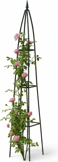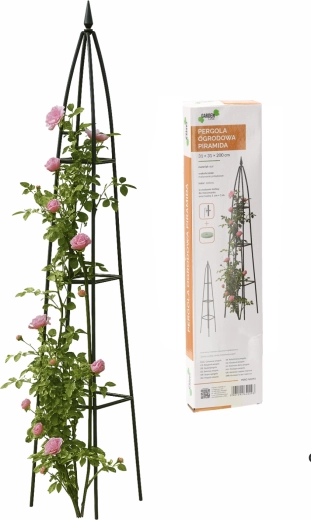 Elegant obelisk-pergola i pyramideform giver en stabil støtte til klatreplanter som roser, klematis og vedbend. Takket være den stålramme med pulverlakering i mørkegrøn farve er den vejrsbestandig og passer perfekt i haven, på altanen og terrassen. Nem montering og ankre i pakken sikrer hurtig og sikker fastgørelse i jorden.
