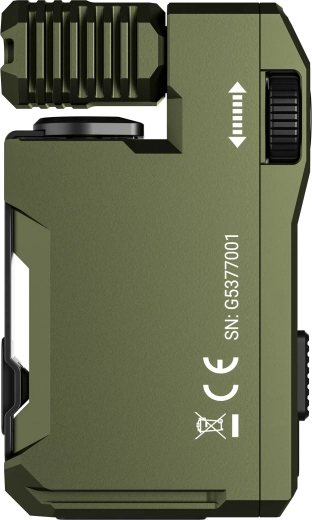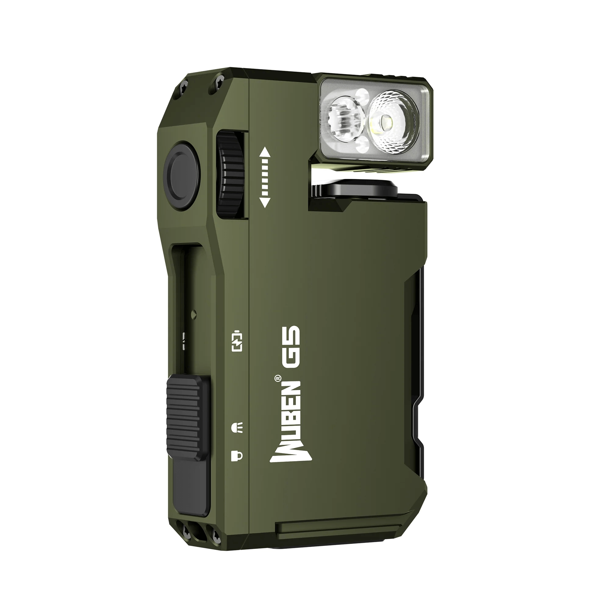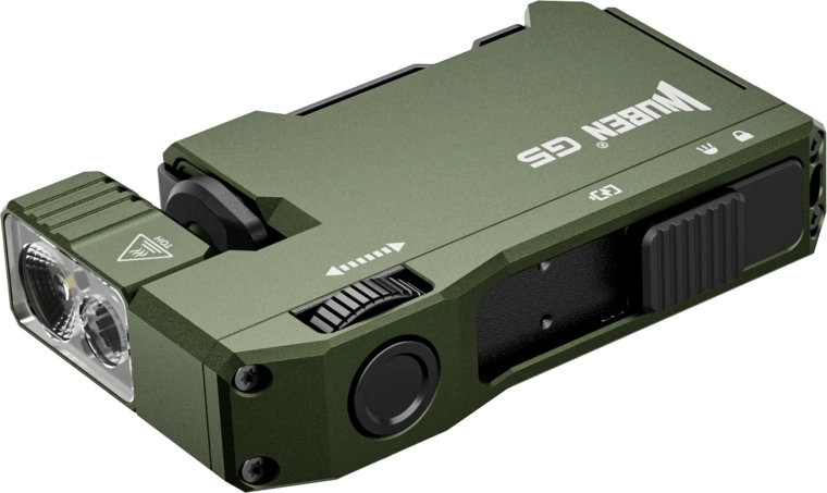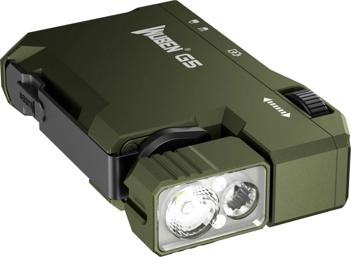 Den kompakte lommelygte Wuben G5 i armygrøn tilbyder 400 lm lysstyrke, IP68-robusthed, drejbart hoved 180°, magnetisk base og en praktisk clip til hands-free brug. Den har trinfri dæmpning 2–400 lm, RGB-dioder med 7 farver og opladning via USB‑C med passthrough til samtidig drift og opladning.