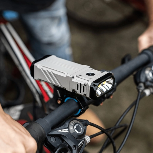 Praktisk opladningsetui i aluminium med kapacitet på 3000 mAh oplader lygten trådløst og oplades selv via USB‑C. Ideelt til rejser og i felten.