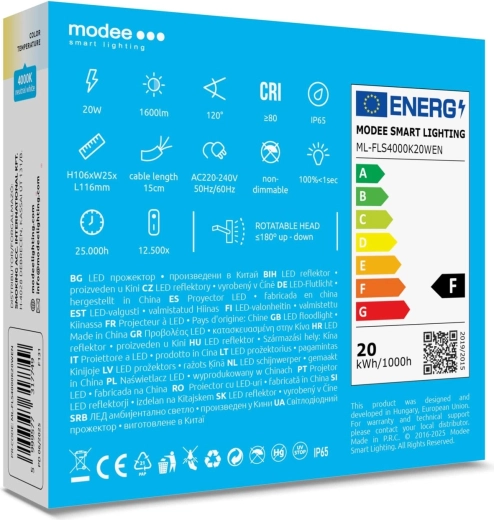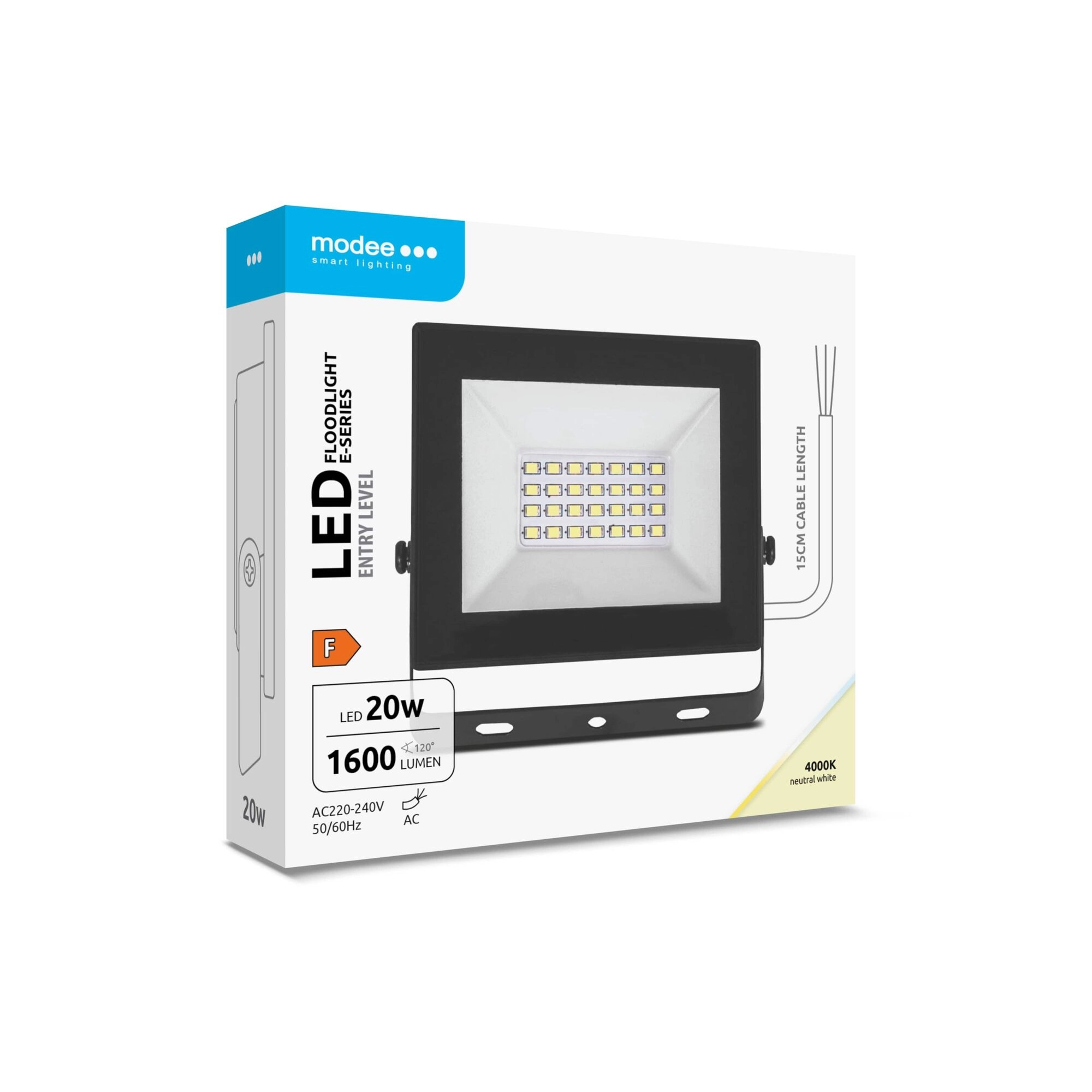 Leder du efter en energibesparende, men kraftig udendørs belysning? MODEE E‑series Slim kombinerer høj lysstrøm på 1600 lm med lavt forbrug på 20 W og neutralhvidt lys på 4000 K, som gengiver farver naturtro og er behageligt for øjnene. Den brede lysvinkel på 120° dækker sikkert indkørslen, en mindre have, terrasse eller arbejdsområde.