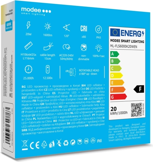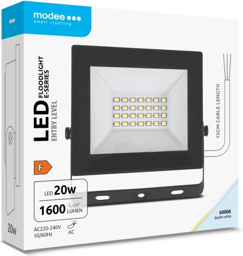 Den kompakte og kraftige MODEE E‑series Slim LED‑projektør tilbyder 20 W effekt, lysstrøm på 1600 lm, bred strålevinkel på 120° og koldt dagslys på 6000 K. Med kapslingsklasse IP65 modstår den støv og kraftige vandstråler og er ideel til belysning af indkørsler, haver, terrasser og gårdrum. For nem montering er den udstyret med en 15 cm tilslutningskabel og kører på AC 220–240 V.