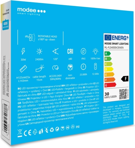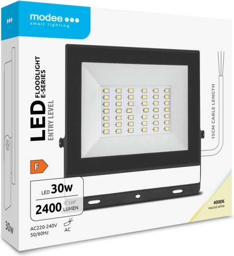 Kraftig LED-projektør Modee E-series Slim 30 W tilbyder en lysstyrke på 2400 lm, en bred strålevinkel på 120° og behageligt neutralt hvidt lys 4000 K. Med IP65-klassificering er den ideel til udendørs brug – indkørsler, terrasser, haver og gårdspladser – med energibesparende drift og nem installation takket være den 15 cm lange kabeltilslutning.