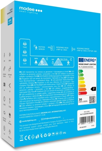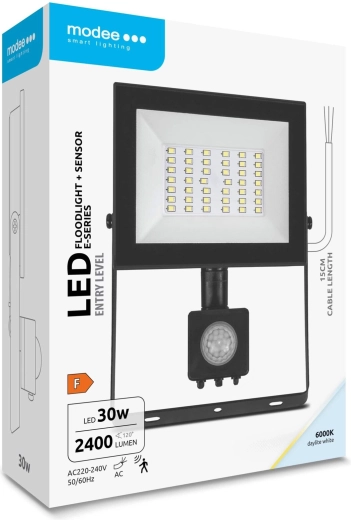 Udendørs LED-projektør MODEE E‑series med bevægelsessensor tilbyder 30 W effekt, en lysstyrke på 2400 lm og koldt hvidt lys 6000 K. Med en bred strålevinkel på 120°, IP54-tætning og nem installation med 1,5 m kabel oplyser den pålideligt indkørsler, haver, terrasser og gårdspladser. Tre sensorindstillinger (SENS, TIME, LUX) gør det muligt at finjustere driften præcist.