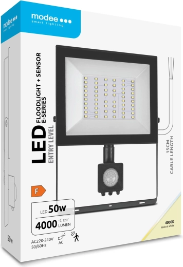 Modee LED-projektør E‑series er en pålidelig løsning til effektiv udendørsbelysning. Den kombinerer høj lysstyrke på 4000 lm, bred dækning på 120° og neutralt hvidt lys 4000 K for naturlig farvegengivelse og god synlighed. Med IP54 modstår den støv og stænk af vand og er derfor ideel til belysning af garageporte, lagre, haver og terrasser.