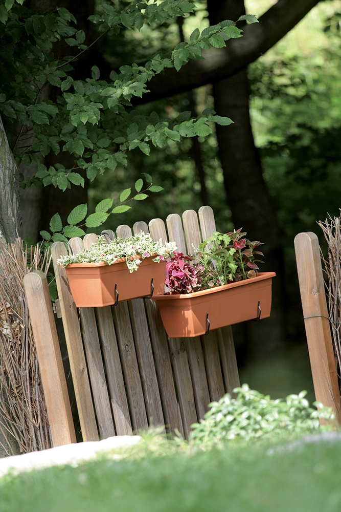 Ideel til dyrkning af blomster og krydderurter på altanrækværk og havehegn. Lange, rillede plantekasser står stabilt på plads.
