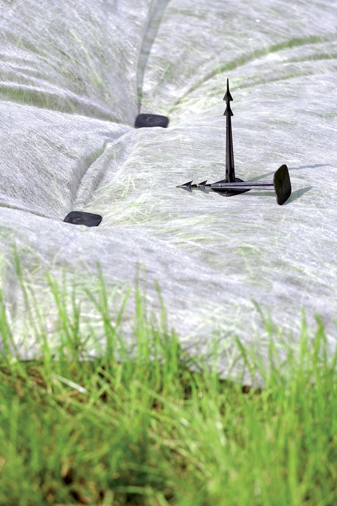 Det flade, brede hoved presser agrotekstilen eller folien jævnt mod underlaget og minimerer dermed løft, underblæsning og bevægelse af materialet.