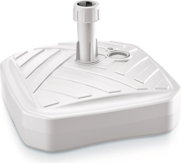 Den praktiske parasolbase UMBRELLA i et moderne kvadratisk design og hvid farve passer perfekt i enhver udendørs indretning. Overfladen med rattanlook virker elegant og er samtidig let at vedligeholde. Takket være den robuste plast tåler den både sol og regn, mens muligheden for at fylde op til 12 liter vand eller sand giver den nødvendige stabilitet selv i mere blæsende vejr.
