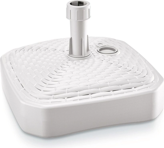 Praktisk og elegant parasolfod UMBRELLA med mål 39 × 39 cm i hvid farve sikrer stabil støtte til parasollen i haven, på terrassen eller altanen. Den er fremstillet af slagfast plast med UV-beskyttelse, kan fyldes med vand eller sand op til 12 l og er kompatibel med stænger med en diameter på 24–30 mm.