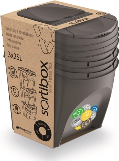 Praktisk sæt med tre Sortibox-beholdere til affaldssortering i dekor grå sten, som tilbyder modulær konstruktion, nem stabling og bekvem sortering af husholdningsaffald. Hver beholder har et volumen på 25 l, så du i alt får 75 liter plads til effektiv og overskuelig opbevaring af affald.