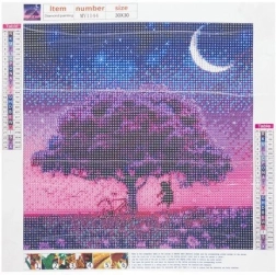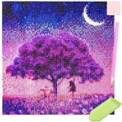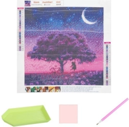 Motivet med træet i rosa‑lilla toner og halvmåne giver en betagende glitrende effekt, som tager sig flot ud både med og uden ramme. Diamantmaling er ideel til mental ro, udvikling af finmotorik og kreativitet – velegnet til både begyndere og øvede.