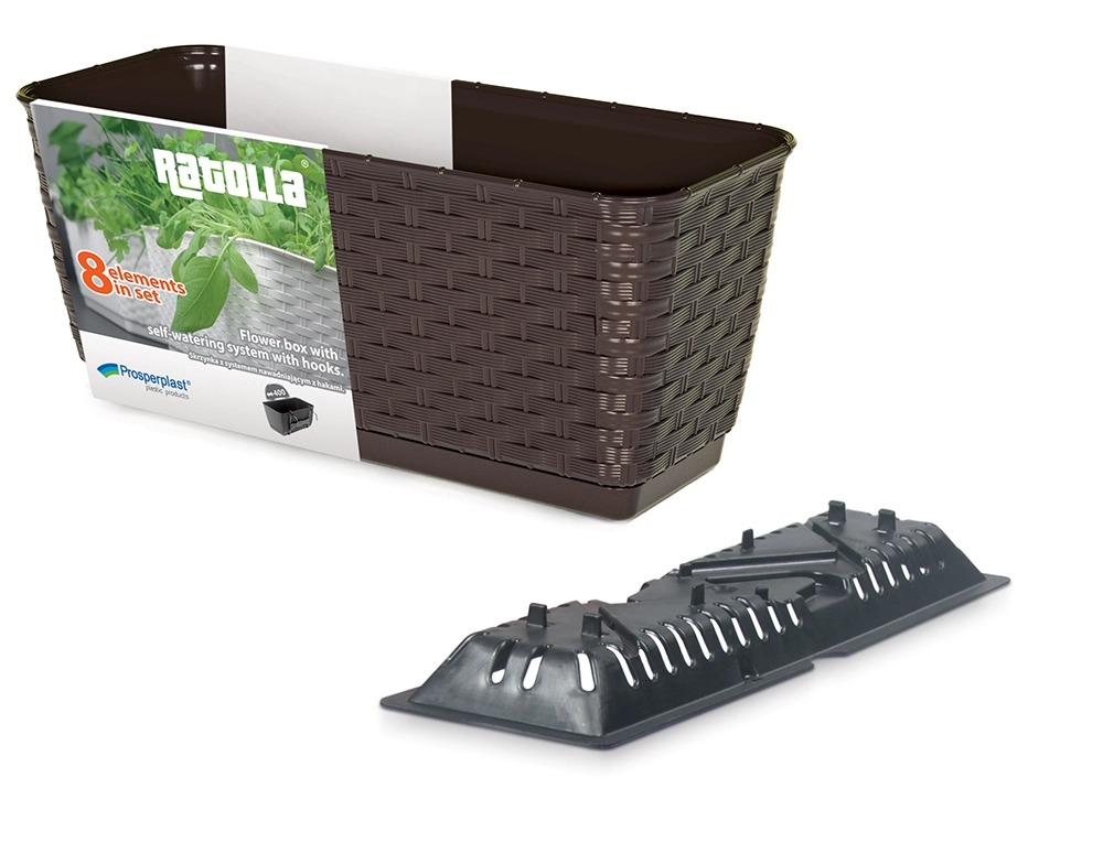 Elegant altankasse med kroge RATOLLA i længden 40 cm i hvid farve udmærker sig ved en realistisk imitation af flettet rattan og praktisk ophæng på gelænder. Den er fremstillet af holdbar plast, som tåler frost, UV-stråling og fugt, og den er let at vedligeholde. Inkluderer underskål og indsats for effektiv vanding. Ideel til altaner, terrasser og vinduer – sparer plads og sikrer stabilitet, lang levetid og et stilfuldt udseende.