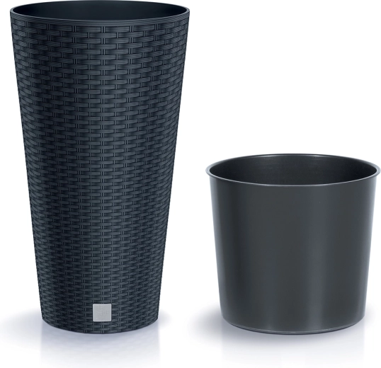 Elegant høj blomsterkrukke med tekstur, der imiterer rattan, i antracitfarve giver ethvert rum et moderne udtryk. Den er fremstillet af kvalitetsplast, som er modstandsdygtig over for UV-stråling, og er velegnet til både indendørs og udendørs brug. Takket være den aftagelige indsats er plantning og vedligeholdelse nem og ren. Den lette konstruktion gør den nem at flytte. For længere levetid bør den beskyttes om vinteren, da den ikke er frostbestandig.