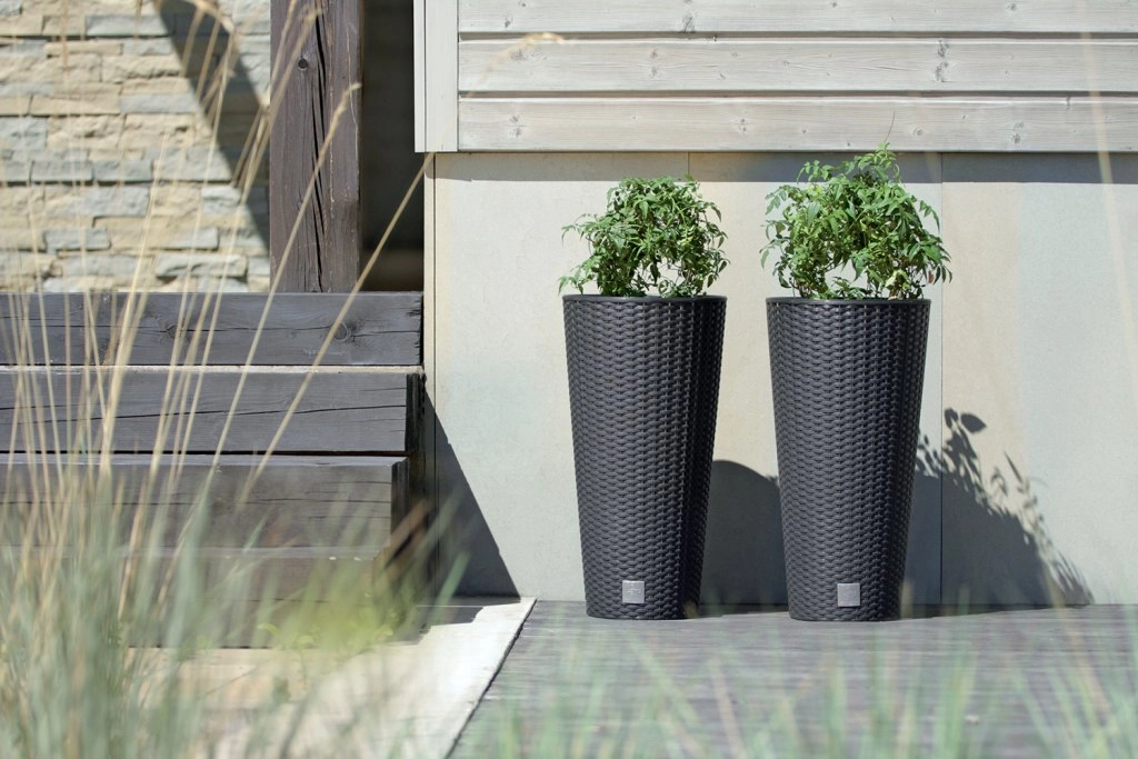 Skab en repræsentativ indgang, terrasse eller opholdskrog med den høje blomsterkrukke PROSPERPLAST Rato Tubus. Den stilfulde rattanstruktur og den tidløse antracitfarve passer nemt ind i både moderne og klassiske arrangementer. Holdbar plast sikrer farve- og formstabilitet ved almindelig udendørs brug.