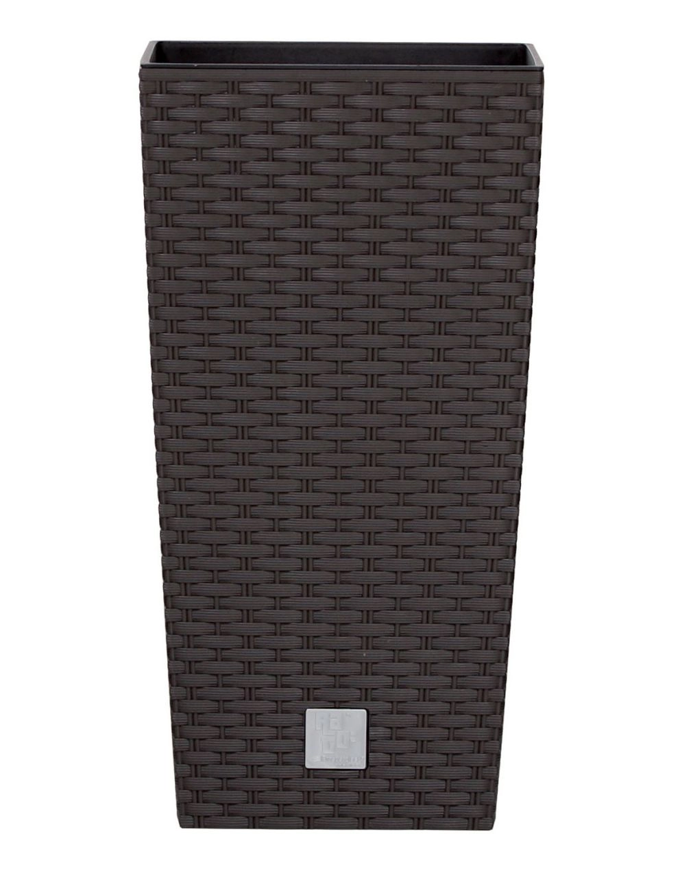Den høje kvadratiske plantekasse Rato Square kombinerer et stilfuldt rattanlook med praktiske egenskaber. Den robuste plast tåler regn, sol og frost, hvilket gør den til et oplagt valg til helårsbrug både inde og ude. Takket være den udtagelige indsats går omplantning hurtigt og rent.