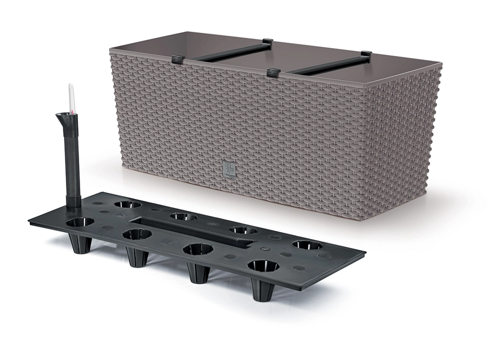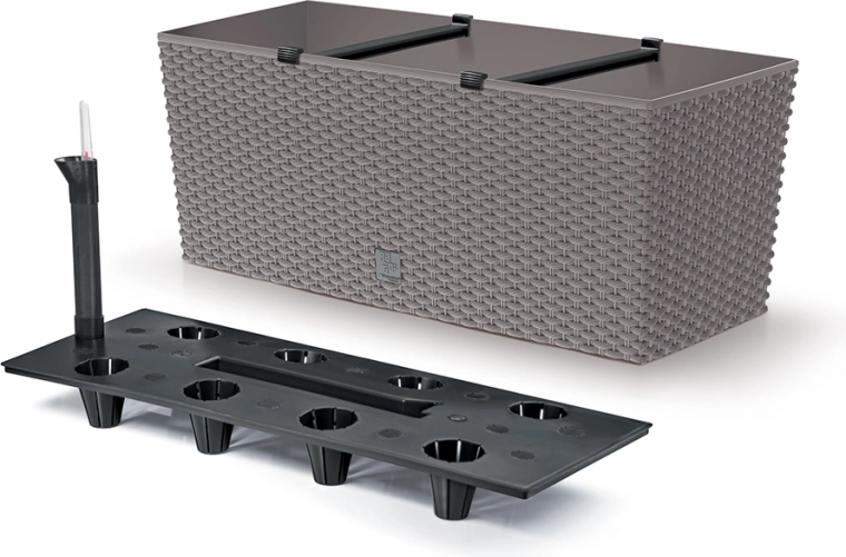 Opdag en stilfuld altankasse med rattanstruktur, som flot supplerer altan, terrasse og vindueskarm. Robust plast giver modstand mod vejrpåvirkninger og en stabil farve uden at blege. Med det selvvandende system forbliver substratet fugtigt længere, så du vander sjældnere, og planterne trives selv på varme dage.