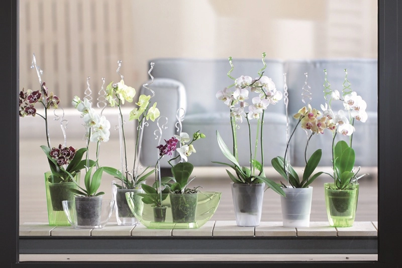 Den transparent hvide overflade går i ét med potten og planten og lader orkidéblomsterne træde frem.