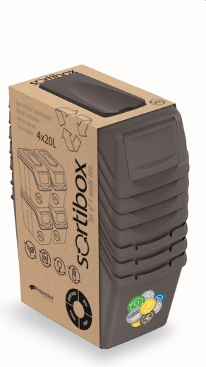 Et praktisk sæt med 4×20 liter SORTIBOX-sorteringsspande er ideelt til hjemmet og kontoret. Takket være den modulære konstruktion kan de nemt kombineres, stables og tilpasses rummet. Den elegante farve grå sten passer ind i et moderne interiør og gør overskuelig affaldssortering lettere.