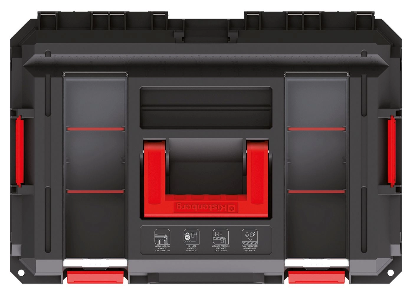 Ribbede vægge, forstærkede hængsler og massive spænder sikrer lang levetid. Kuffertens kapacitet er op til 50 kg, direkte belastning af moduler op til 120 kg.