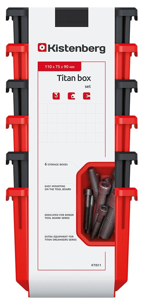 Sættet med 6 TITAN BOX-bokse i en elegant sort/rød kombination er ideelt til sortering og sikker opbevaring af skruer, søm, bits, rawlplugs og andet småt tilbehør. Takket være de kompakte mål 110 × 75 × 263 mm passer de nemt i reoler, skuffer og værkstedsvægge.