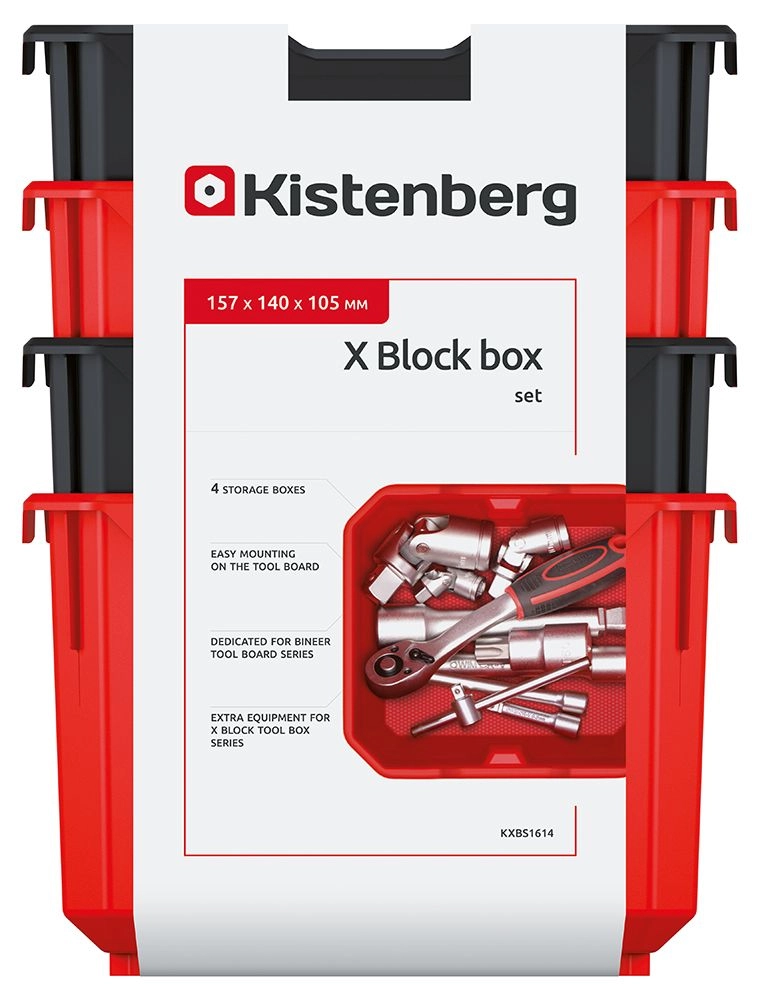 Sættet med fire modulære bokse X Block Box tilbyder en smart og robust løsning til sortering og opbevaring af smådele. Boksene har åben top og front for nem håndtering, forstærkede kanter og formet kant for sikker stabling på hylde og i reol.