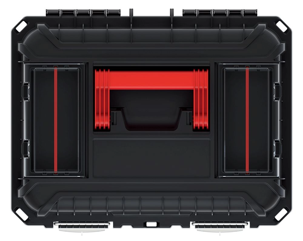 Takket være det solide plastikhåndtag er kassen nem at bære, og den udtagelige indsats sparer tid under arbejdet – det vigtigste er altid lige ved hånden. Praktiske udvendige rum giver ekstra plads til skruer, bits og andre små dele.