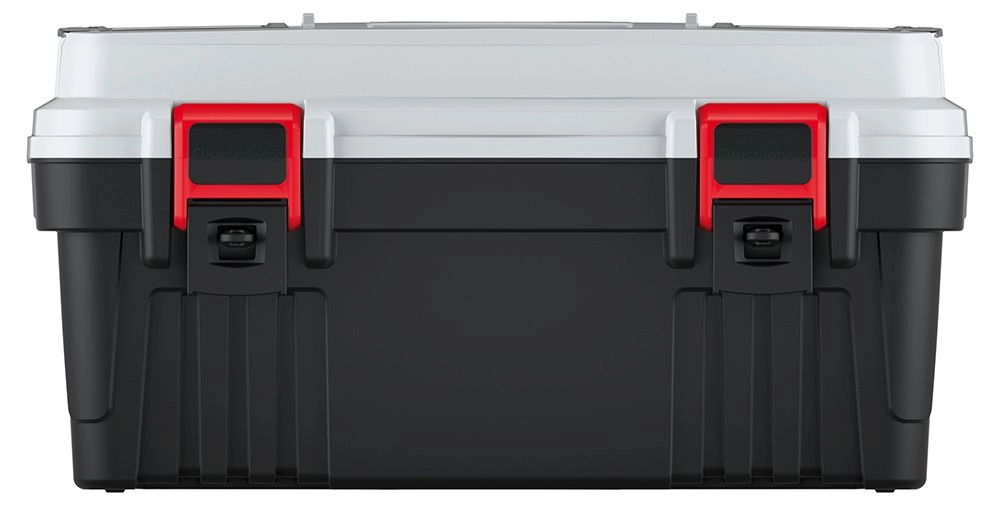 Kraftige låsespænder og slidstærk plast beskytter indholdet under transport – selv i krævende værksteds- eller byggepladsforhold.