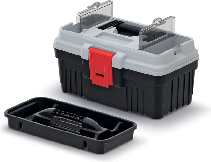 Den praktiske værktøjskasse Optima i elegant grå farve tilbyder kompakte mål 296 × 178 × 153 mm, en aftagelig indsats for bedre organisering og udvendige, aflåselige rum til småting. Ideel til både hjemmeværkstedet og professionel brug.