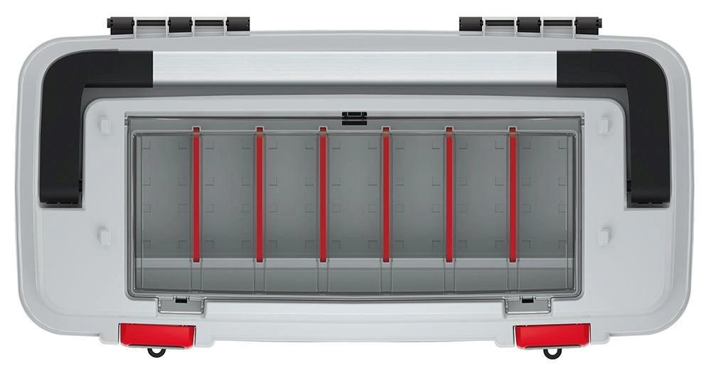 Det transparente låg og de røde skilleplader giver hurtigt overblik over indholdet og adskiller skruer, bits og andre smådele sikkert.