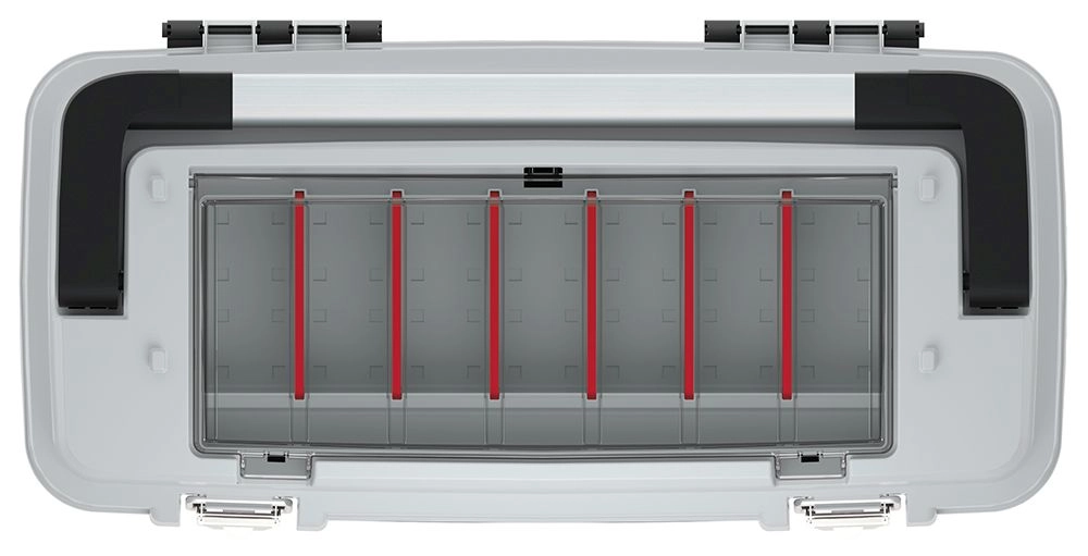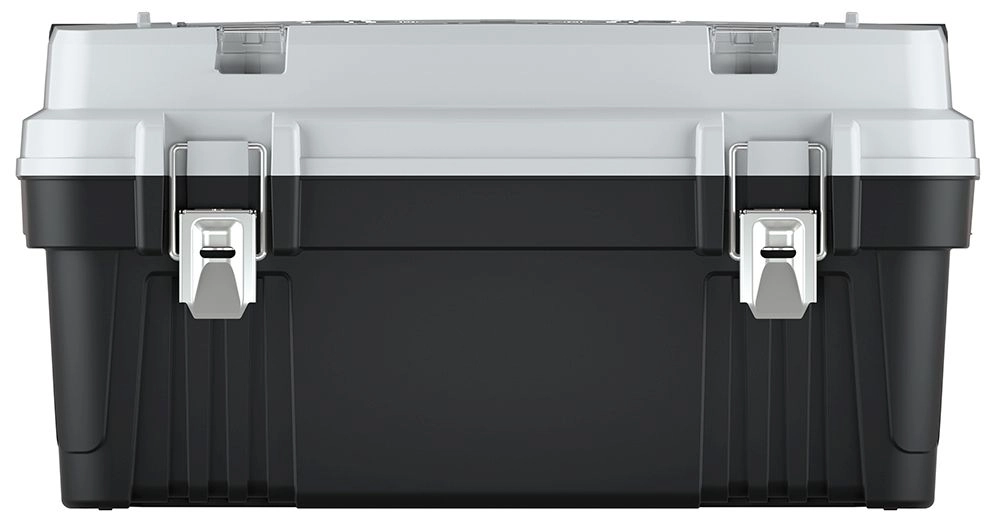 Det øverste/udvendige aflåselige rum med justerbare skillevægge holder skruer, bits og rawlplugs på plads, og det gennemsigtige låg giver hurtigt overblik. Den udtagelige indsats lader dig have det mest anvendte værktøj lige ved hånden og sparer samtidig plads i hovedrummet.