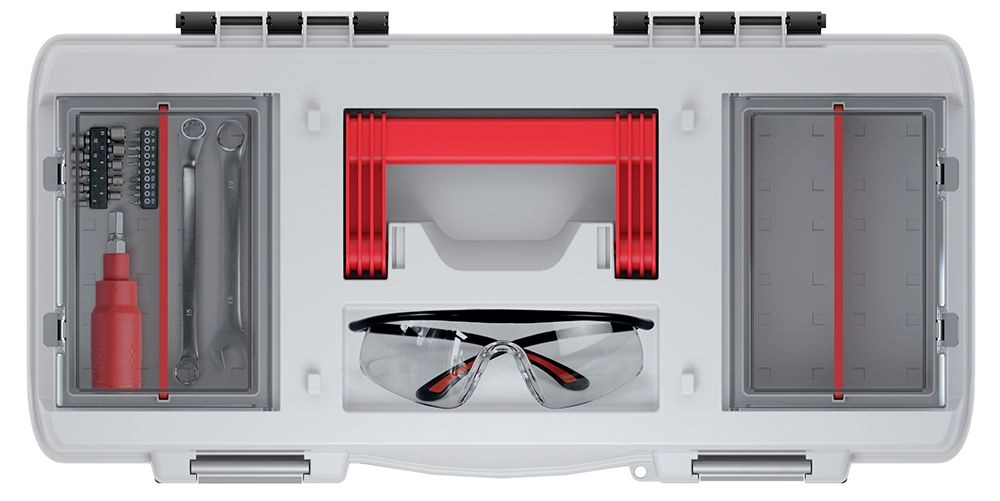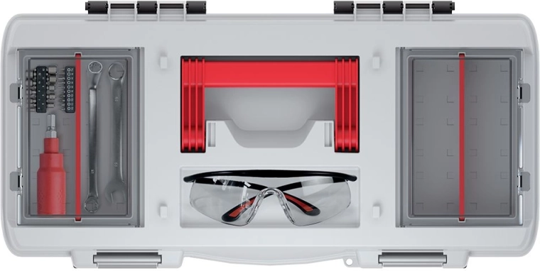 Takket være den aftagelige indsats kan du nemt tilpasse den indvendige organisering til dine behov. Den robuste udførelse og de praktiske mål 548 × 274 × 286 mm muliggør bekvem transport og opbevaring af værktøj og tilbehør.