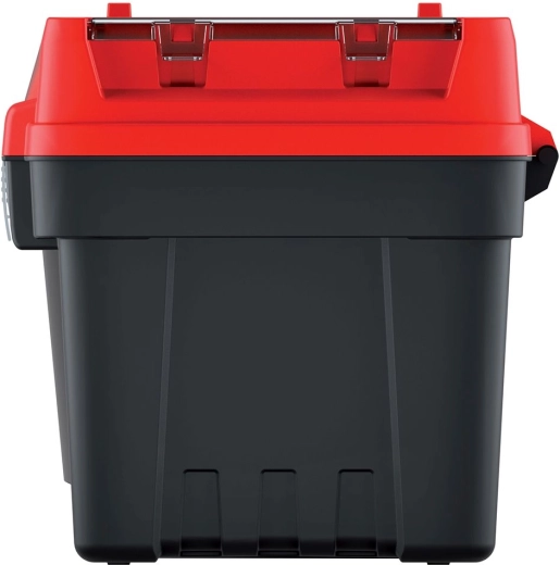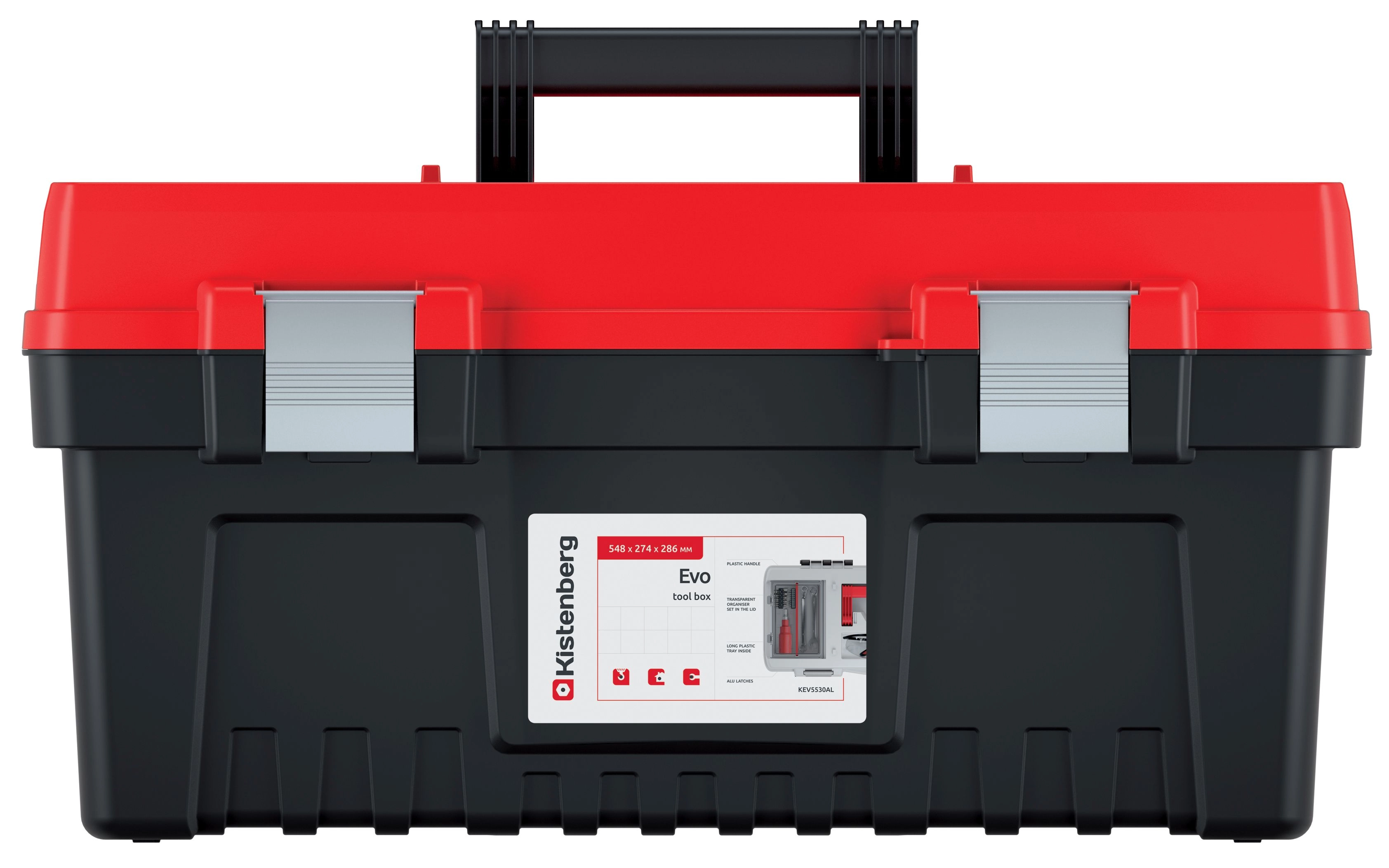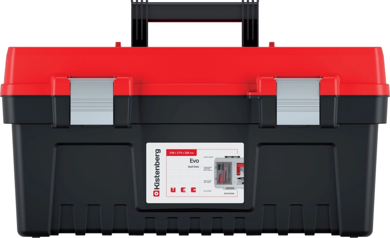 Praktisk værktøjskasse i størrelsen 548 × 274 × 286 mm i elegant rød farve, udstyret med holdbare metallåse, lukbare udvendige rum og aftagelig indsats for nem organisering og hurtig adgang til dine værktøjer.